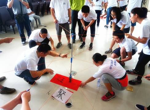 活動需要大家協(xié)作配合共同用繩子拉住一只巨大的毛筆來完成各種風(fēng)格的書法作品。需要團隊成員充分發(fā)揮自身優(yōu)勢在協(xié)作中主動承擔(dān)不同的角色并積極主動的進行溝通,每一幅作品都是團隊智慧與隊員個性的融合。