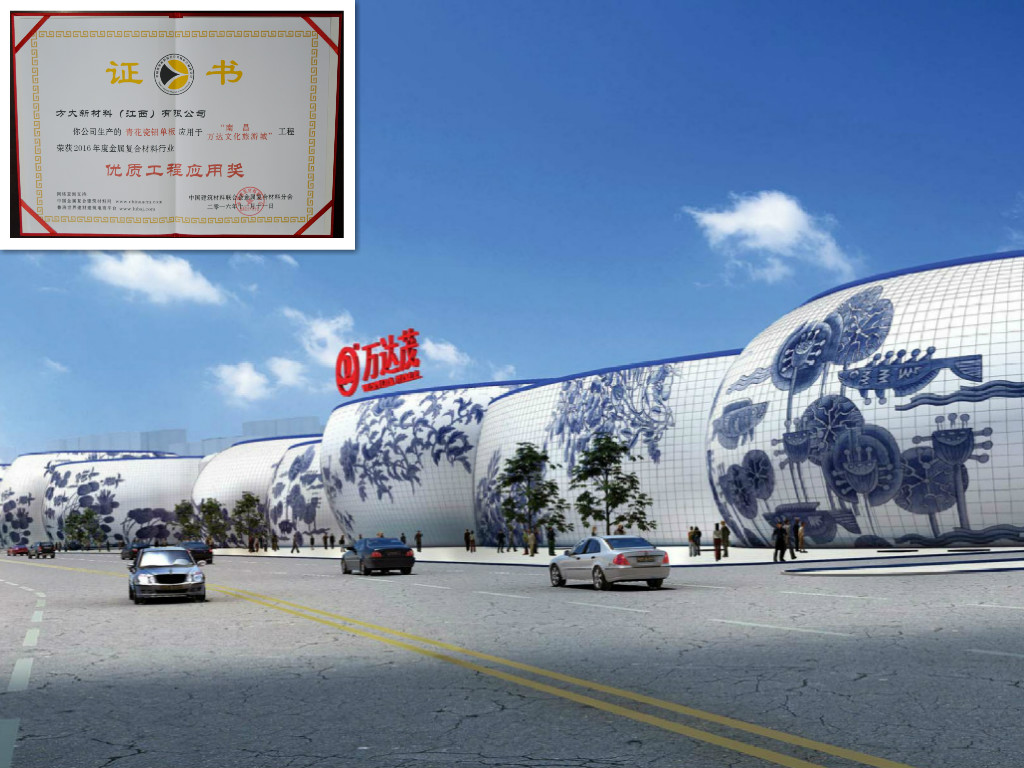 方大青花瓷鋁單板應(yīng)用于南昌萬達文化旅游城,榮獲2016年度金屬復(fù)合材料行業(yè)“優(yōu)質(zhì)工程應(yīng)用獎”