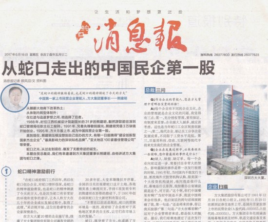 6月16日,《蛇口消息報》刊登題為“從蛇口走出的中國民企第一股”專訪文章,重點報道國內(nèi)首家上市民營企業(yè)——方大集團股份有限公司作為蛇口精神的傳承者,成立26年來始終秉承“科技為本,創(chuàng)新為源”的經(jīng)營理念,不忘初心,砥礪前行,在節(jié)能環(huán)保領(lǐng)域不斷取得令人矚目的成就。當(dāng)前,方大集團正積極參與“一帶一路”國際合作和“粵港澳大灣區(qū)”建設(shè),大力拓展海外市場,努力將方大高端幕墻系統(tǒng)、方大軌道交通站臺屏蔽門等創(chuàng)新成果推向全世界。