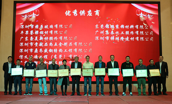 合作伙伴大會期間對在過去一年在與方大建科合作中有突出貢獻的合作伙伴頒發榮譽獎項,會上,方大建科合作進步獎、最佳服務獎、卓越品質獎、優秀供應商、金牌合作伙伴供應商五項大獎,東莞南玻工程玻璃有限公司等33家企業受到榮譽表彰。