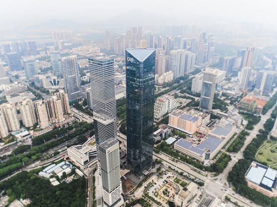 深業上城(南區)塔2位于深圳市福田區的中心,建筑高度300米,大廈的外形簡潔,通過內部空間和外立面高水準細節設計來展現建筑的優雅魅力。建筑的外立面為純凈的全超白玻璃幕墻,標準單元板寬度3米、高度4.5米,達到通常分格(1.5米)的兩倍,最大的單元板塊高度達8米,為用戶提供無遮擋視覺效果。為了降低風荷載,在塔樓四角做了內凹處理,L型的轉角板塊為1.5+3米。方大建科在施工過程中,對超高單元板塊垂直運輸、安裝等難點認真分析并給出了最優的施工方案,通過生產、施工環節的質量控制實現了玻璃及板塊平整度的極致效果。項目完成后,建筑水平與垂直線條勾勒出秩序均衡美,簡練、寧靜外立面體現人與自然和諧融合。