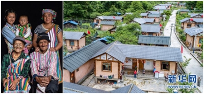 這是一張拼版照片。左圖:怒江傈僳族自治州貢山縣獨龍江鄉(xiāng)迪政當(dāng)村獨龍族的“文面女”李文仕(前排左)一家合影(6月21日攝);右圖:李文仕和其他村民的房子(6月21日攝),這些房子是當(dāng)?shù)卣?011年統(tǒng)一修建的。新華社記者 江文耀 攝