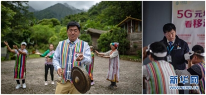 這是一張拼版照片。左圖:在怒江傈僳族自治州貢山縣獨龍江鄉(xiāng)移動營業(yè)廳上班的馬春海(獨龍族)。在他身后,獨龍族群眾在跳本民族舞蹈(6月21日攝);右圖:馬春海在指導(dǎo)當(dāng)?shù)厝罕婓w驗5G虛擬現(xiàn)實設(shè)備。獨龍江鄉(xiāng)今年開通了5G試驗基站(6月21日攝)。新華社記者 江文耀