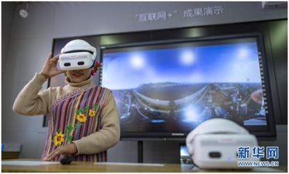 獨龍族姑娘熊玉蘭在怒江傈僳族自治州貢山縣獨龍江鄉(xiāng)體驗VR眼鏡(4月19日攝)。新華社記者 江文耀 攝