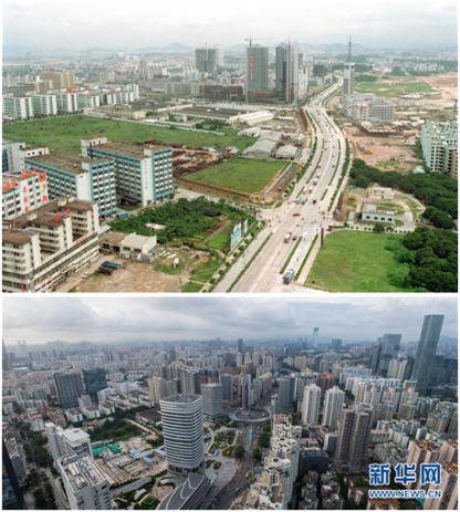 拼版照片:上圖為位于深圳南頭半島上的南油開發(fā)區(qū)(資料照片,新華社記者張肄文攝);下圖為2018年6月20日拍攝的原南油開發(fā)區(qū)(新華社記者毛思倩攝)。新華社發(fā)
