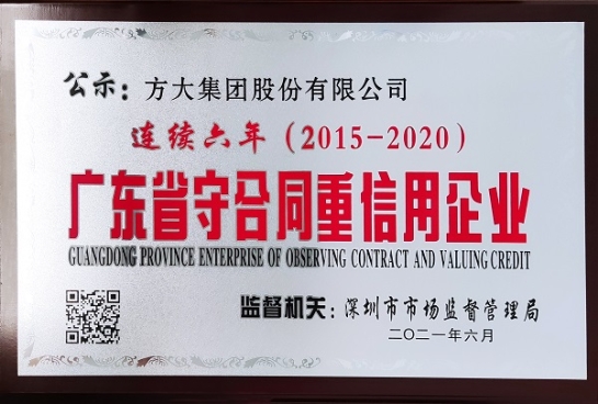 近日,廣東省市場監(jiān)督管理局的2020年度“廣東省守合同重信用企業(yè)”評選揭曉,方大集團憑借優(yōu)秀的公司治理及合同管理連續(xù)六年(2015-2020)榮獲“廣東省守合同重信用企業(yè)”稱號。